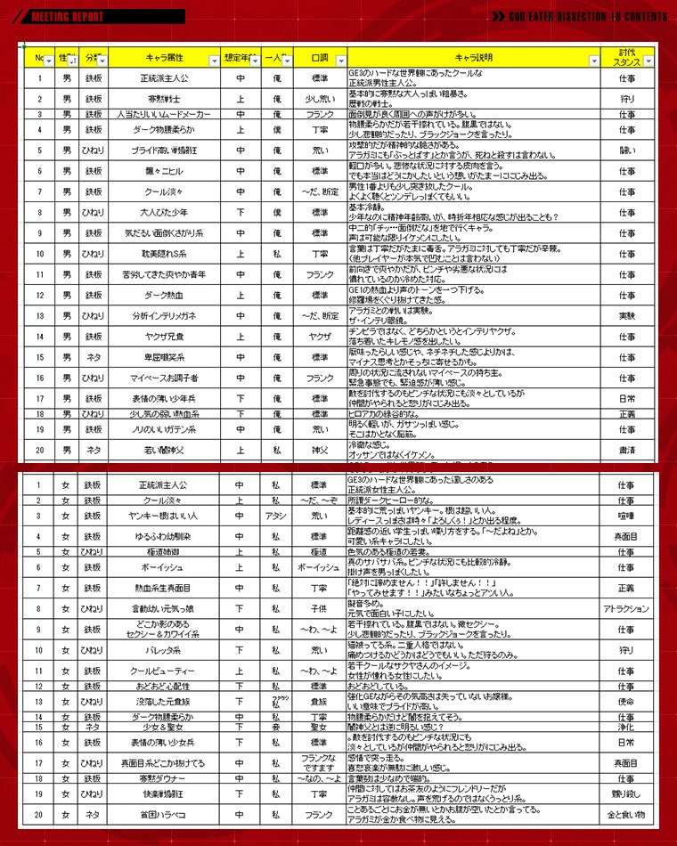 『GOD EATER 2』のキャラクターボイスで検討された資料(一部抜粋)