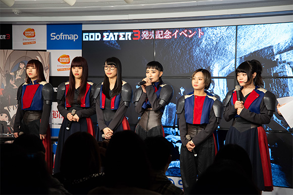 続いてスペシャルゲストとして、『GOD EATER 3』オープニングテーマ「stereo future」を担当した、セントチヒロ・チッチさん、モモコグミカンパニーさん、リンリンさん、ハシヤスメ・アツコさん、アイナ・ジ・エンドさん、アユニ・Dさんの6名から成るBiSHが登壇! 大きな拍手に感激した様子のメンバーを迎え、『GOD EATER 3』のオープニングアニメーションを上映。オープニングテーマ「stereo future」の曲調とぴったりとあったハイクオリティのアニメーションに会場は大きな拍手に包まれました。