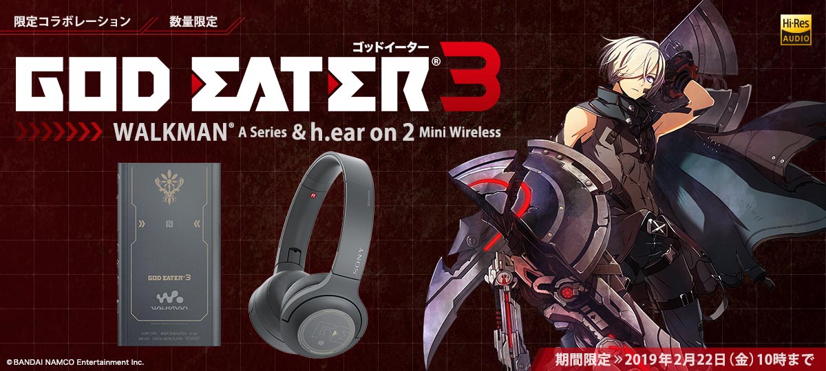 さらに最新情報として、「ウォークマン®Aシリーズ 『GOD EATER 3』Edition」及び「h.ear on 2 Mini Wireless(WH-H800) 『GOD EATER 3』Edition」の発売が発表されました。ウォークマン®の背面、そしてヘッドホンのハウジング部分にはデザインが刻印され、ウォークマン®には初回限定生産版『GOD EATER 3』特典のサウンドトラックには収録されていない楽曲2曲をプリインストール。クールなパッケージも会場でお披露目されました。
