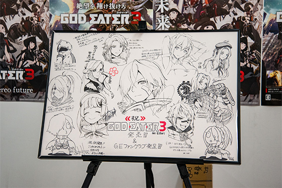 『GOD EATER 3』の発売を記念して制作陣のイラスト&メッセージが入ったイラストボードを「GOD EATER OFFICIAL FANCLUB MEMBERS」では公開中。そのイラストボードの原本は「OFFICIAL FANCLUB MEMBERS」の会員1名様に抽選でプレゼントされます! イベント会場にも設置され、来場者のみなさんの注目を集めていたイラストボード。登壇した富澤シリーズIP総合プロデューサーと富山プロデューサーによるイラストも描かれていますよ。
